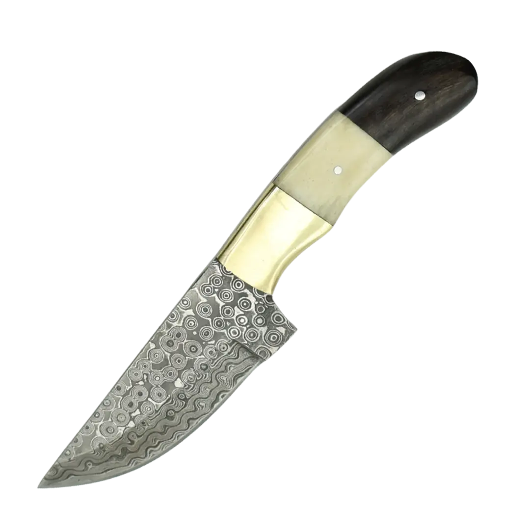 This is one of those Damascus steel knives that looks like it belongs in a museum. The visual contrast between the dark horn and the bright brass is very impressive. You can use this for field work or keep it as a centerpiece in your collection.