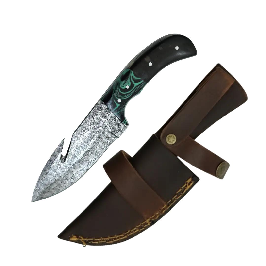 The Emerald Hook is built for the hunter who demands both beauty and power in the field. This gut hook knife is designed to make field dressing a smooth and fast process. It is one of our finest Damascus steel handmade knives because it balances weight and precision perfectly.