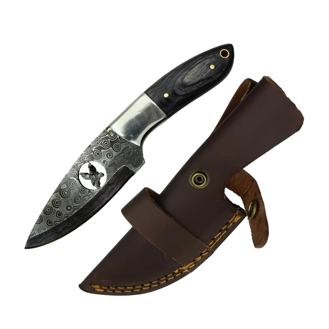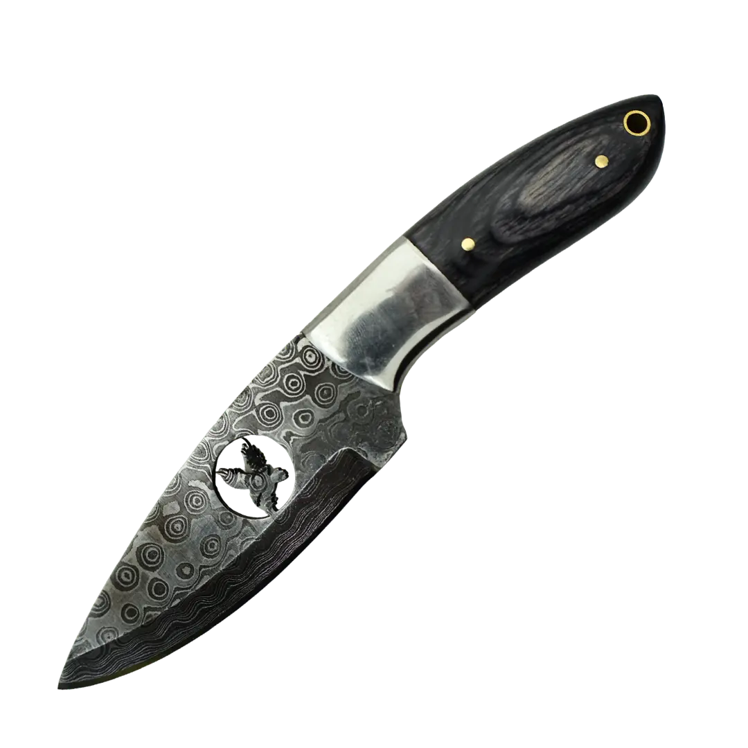 You can see the hand-forged layers of the Damascus blade swirling around the bird cutout. This is one of our most popular Damascus steel handmade knives for young scouts and experienced hikers alike. The straight drop-point profile is perfect for preparing food at camp or carving wood. It feels light in the hand but very robust during use.Β