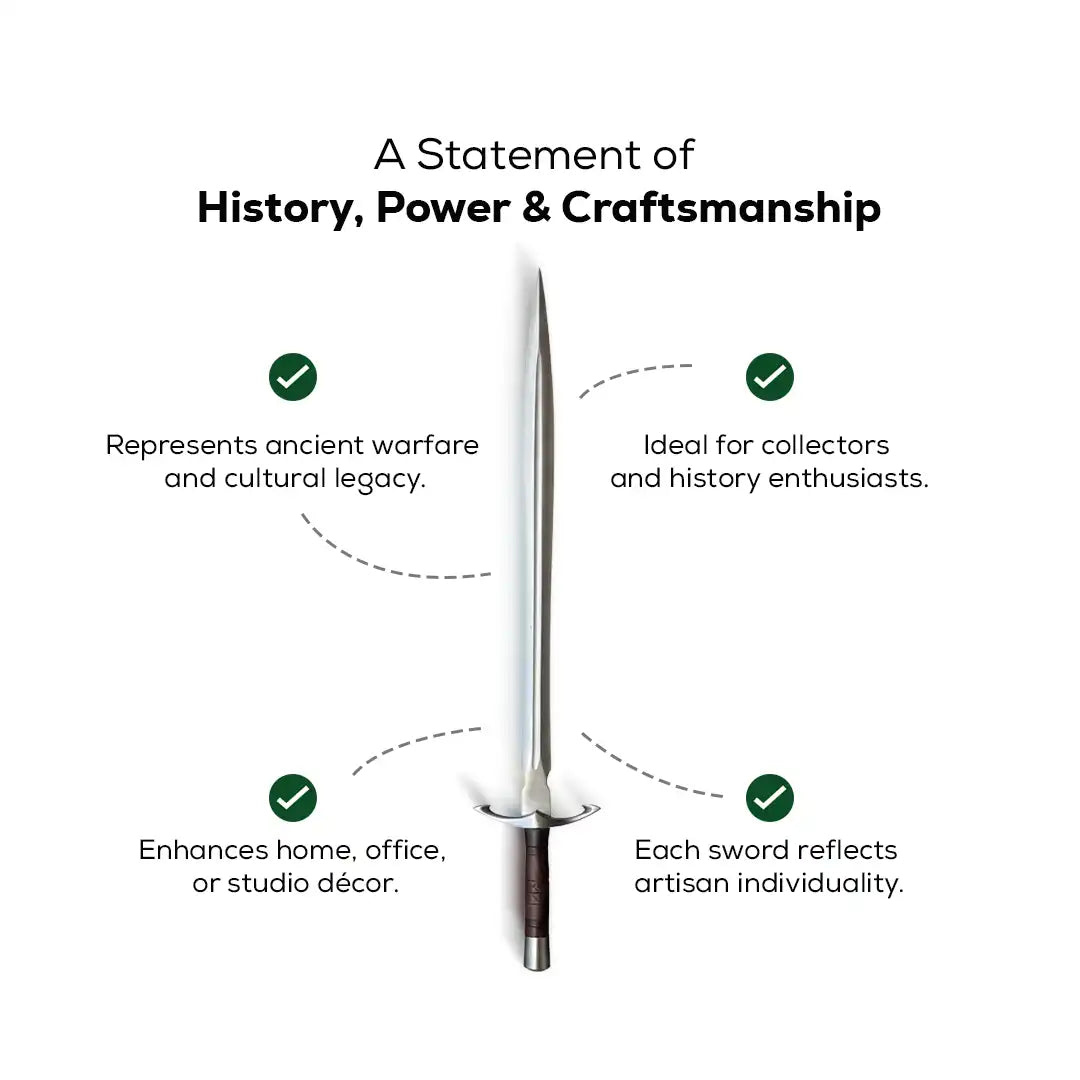 The 7-inch handle, designed for a comfortable grip, complements the blade's balance, making it suitable for collectors, historical enthusiasts, and practical users alike. Whether displayed as a centerpiece or used in reenactments, this 20 inch sword embodies both form and function.